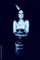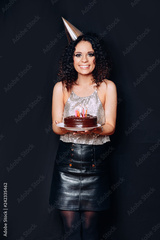 Portrait of a young beautiful brunette girl holding birthday cake with candles on black background