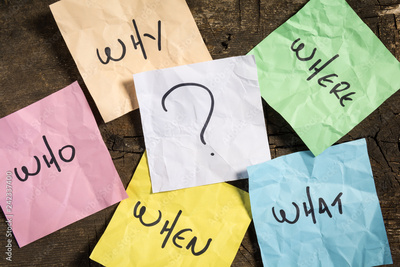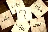 Questions and question marks on crumpled colored note papers on a wooden background