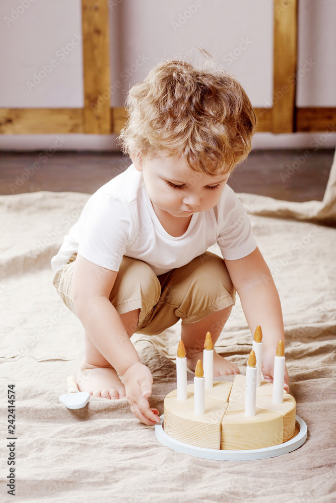 Child boy playing in his room with a wooden toy cake