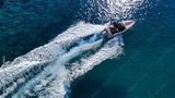 Aerial drone photo of power boat cruising in high speed in deep blue sea