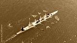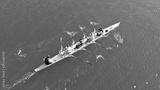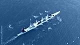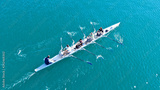 Aerial drone bird's eye view of sport canoe operated by team of young women in emerald clear sea