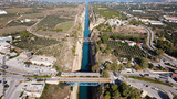 Aerial bird's eye view photo taken by drone of Corinth Canal of Isthmos or Isthmus and road network motorway connecting mainland with Peloponnese, Greece