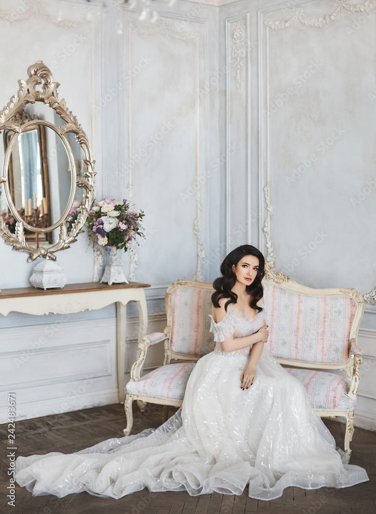 Sensual and beautiful brunette model girl with bright makeup in fashionable lace dress with naked shoulders sits on the antique sofa and posing at luxury vintage interior