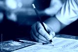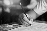 Close-up to student holding pencil and writing final exam in examination room or study in classroom.Vintage style
