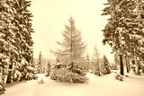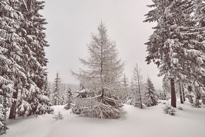 Winter landscape after snowfalls, retro color toning applied.