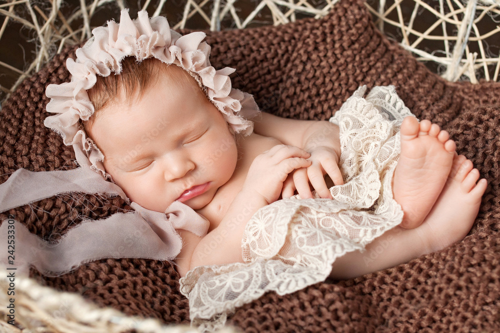 Sweet newborn baby girl sleeps in the basket. Dark brown background.