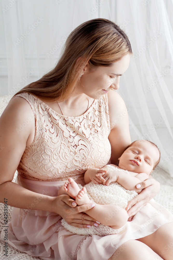 Pretty woman holding a newborn baby in her arms. Motherhood concept. Happy family concept