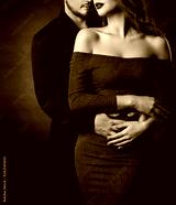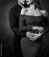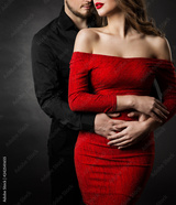 Couple Fashion Beauty, Young Woman in Sexy Red Dress and Embracing Man in Love
