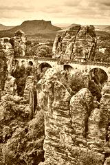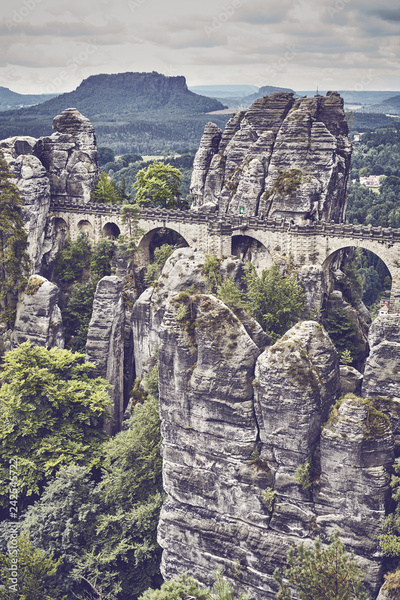 Retro toned picture of the Bastei Bridge in Saxon Switzerland National Park, Germany.