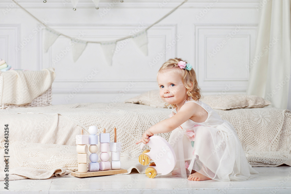 Child girl playing with a wooden toy. Little cute girl with natural toys.