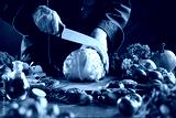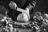 Chef preparing to slice a fresh cabbage