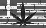 Graffiti street art spray drawing on stencil. Cannabis leaf on brick wall with flag Greece