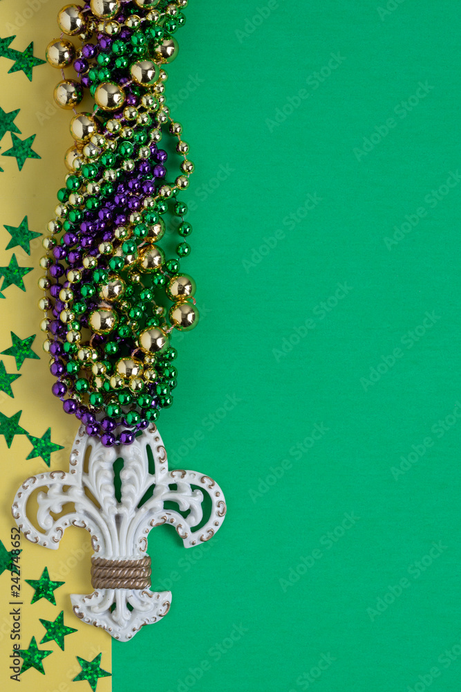 white and gold fleur de lis on mottled green and yellow background with gold stars and beads