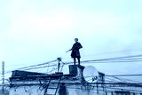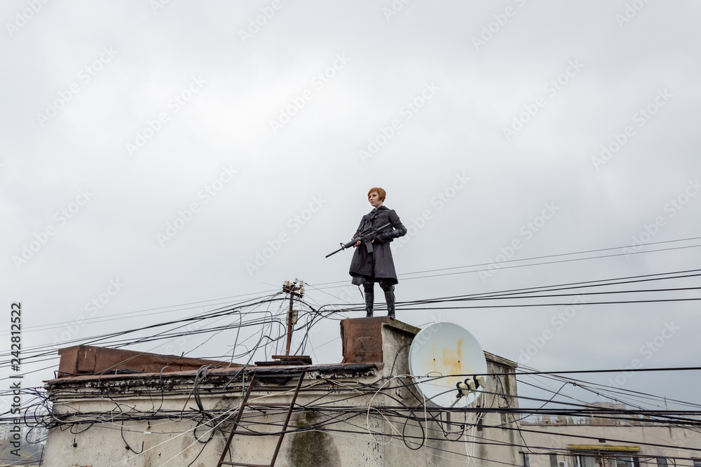 Young woman in modern black techwear style with rifle posing on the rooftop, portrait of redhead woman cyperpunk or post apocalyptic concept