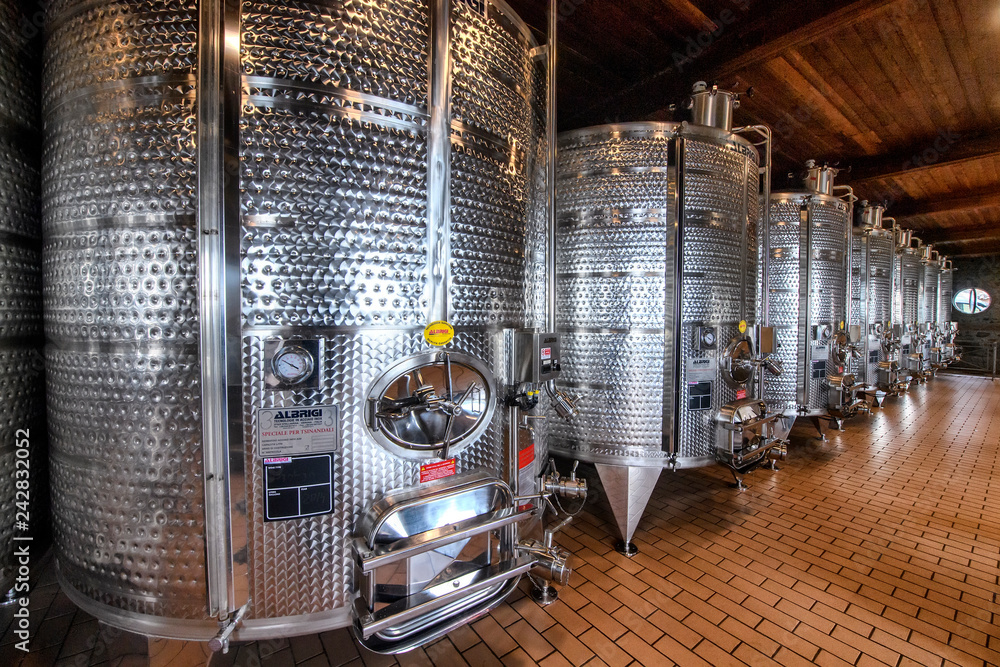 Metal Wine tubs at a wine plant. Tsinandali, Georgia. 28-11-2017