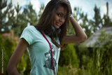 Young beautiful girl with earphones smiling. Outdoor photo.