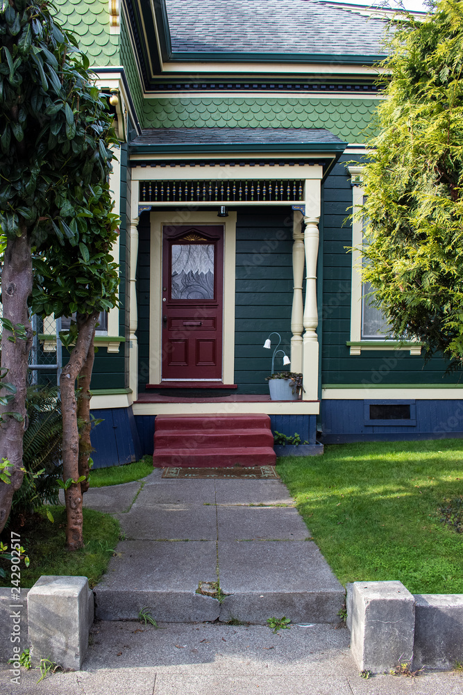 Entrance and porch to colorful victorian gingerbread house with trees - lace curtains in door window