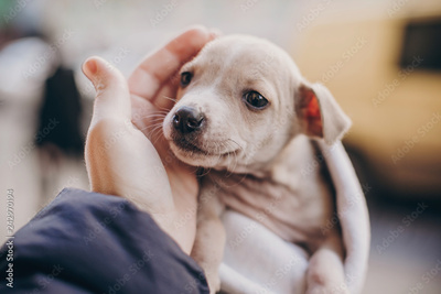 Cute little staff terrier puppy in cozy warm blanket in autumn park. Hand hugging scared homeless beige puppy in city street. Adoption concept. Dog shelter.