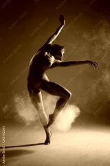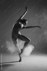 Dancing in cloud concept. Muscle brunette beauty female girl adult woman dancer athlete in fog smoke fume wearing dance bodysuit making emotional dance element performance on isolated grey background