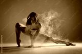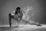 Dancing in cloud concept. Muscle brunette beauty female girl adult woman dancer athlete in fog smoke fume wearing dance bodysuit making sexy dance element performance on isolated grey background