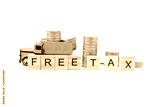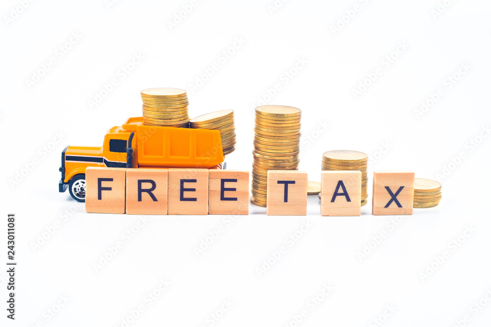 Free Tax word on wooden blocks and coins on white background.