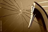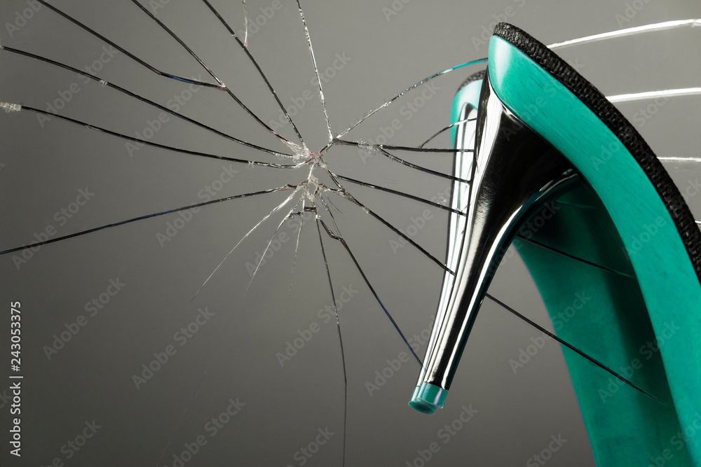 fashionable blue turquoise womwn shoe on the broken reflection mirror background