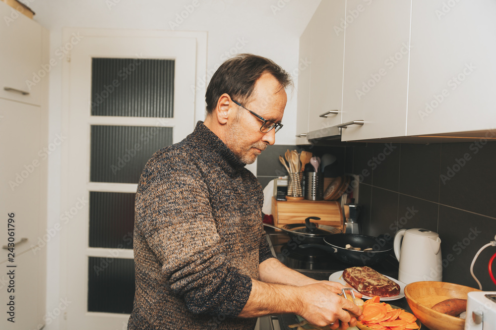 Middle age man cooking dinner in the kitchen, peeling off potato with peeler