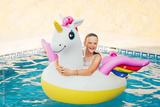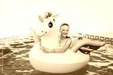 Happy young girl playing in the pool, relaxing on inflatable colorful unicorn