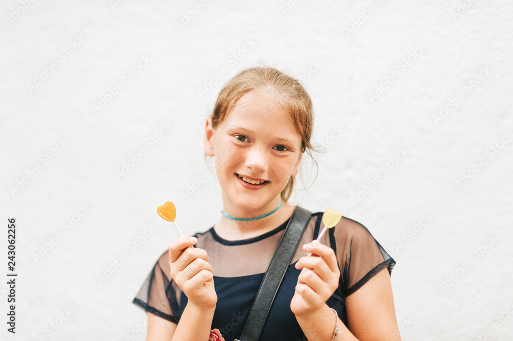 Outdoor portrait of cute kid girl holding heart shaped lollipop candies