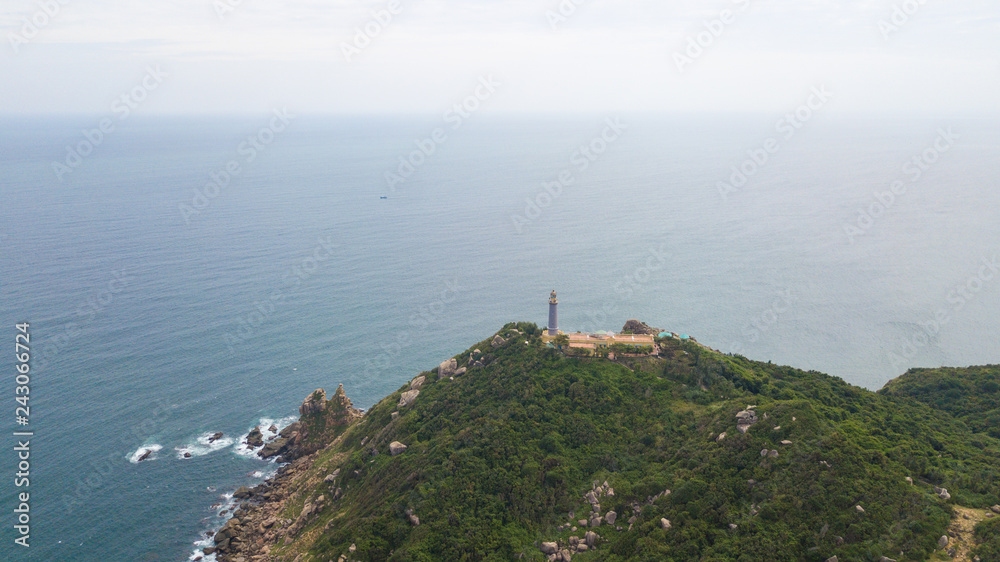 Aerial view of Dai Lanh beach and Mui Dien light house in a sunny day, MuiDien, Phu Yen province - The eastermost of Vietnam. Stock image top view of Mui Dien lighthouse on fractured rocky cliff
