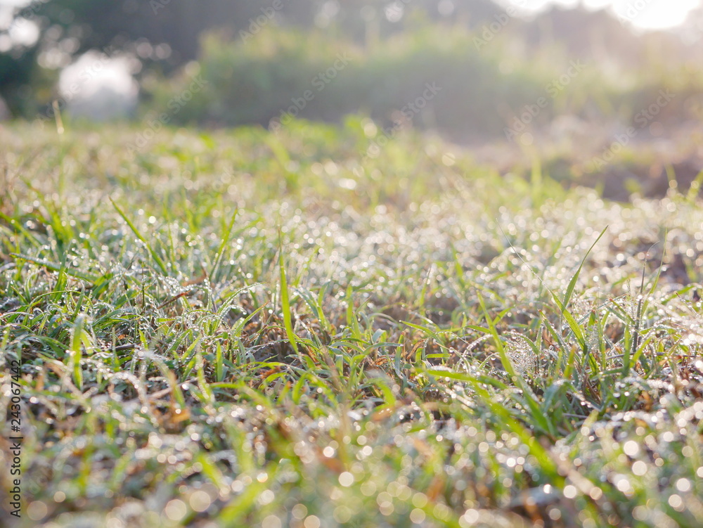 Refreshing green and brown grasses with dew drops in the warm morning sunlight