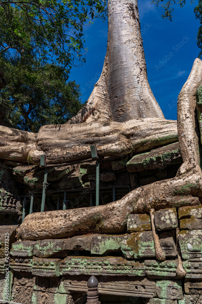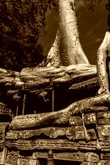 Ruins of Ta Prohm covered by Tetrameles Tree at Angkor, Siem Reap Province, Cambodia
