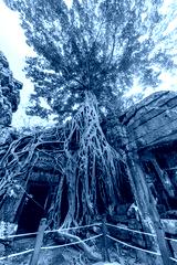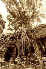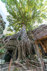 Ruins of Ta Prohm covered by Tetrameles Tree at Angkor, Siem Reap Province, Cambodia