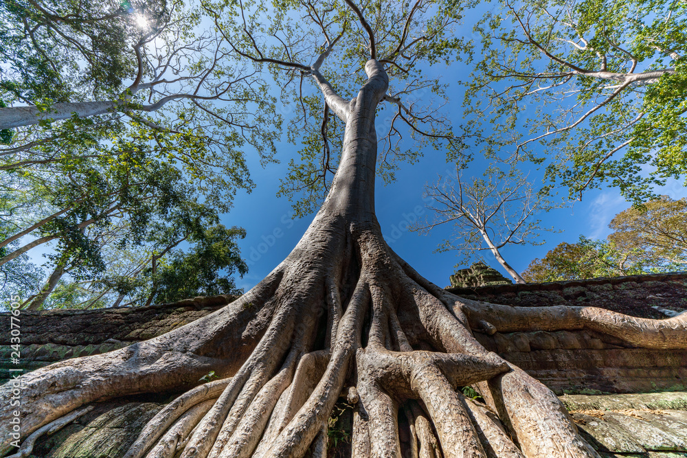 Ruins of Ta Prohm covered by Tetrameles Tree at Angkor, Siem Reap Province, Cambodia