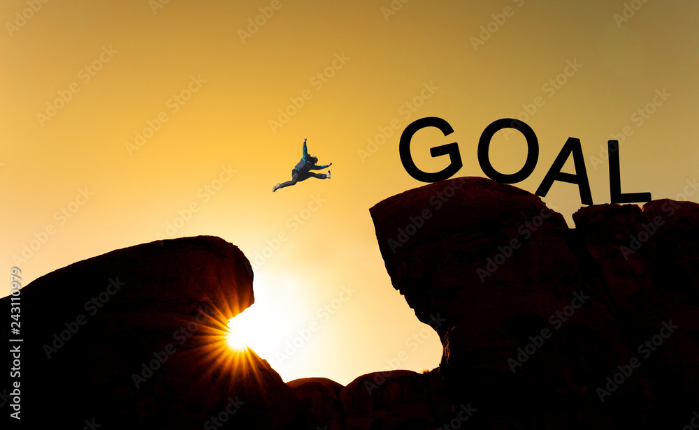Silhouette a man jumping over precipice to goal. Achieve goal, business goals, challenge and success concept