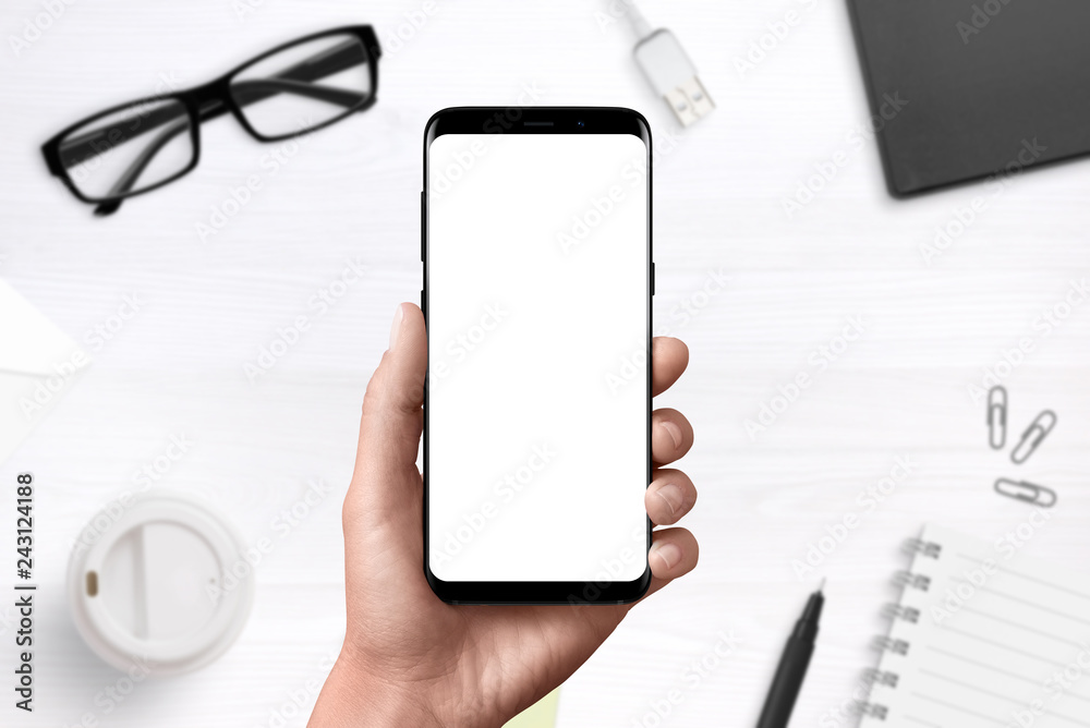 Modern smart phone ih hand with isolated, blank display for mockup, ap design presentation. Office desk in background.