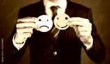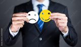 Businessmen holding a face icon facial expressions negative or positive, happy face or sad face, like or dislike, Customer service experience and satisfaction survey concepts.