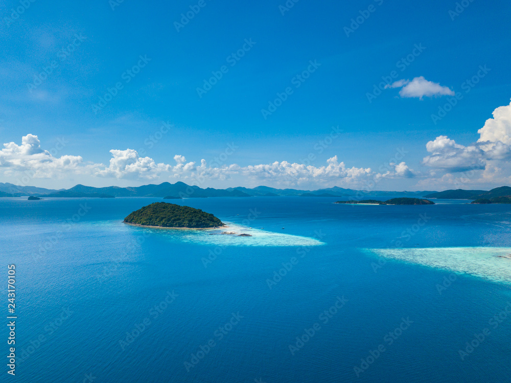 Aerial view of tropical Banana island. Beautiful tropical island with white sandy beach, palm trees and green hills. Travel tropical concept. Palawan, Philippines