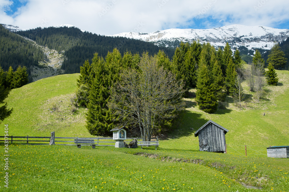 Resting place alongside a hiking trail with a bench and a wayside shrine in the luscious meadows of the Tyrolean Alps.