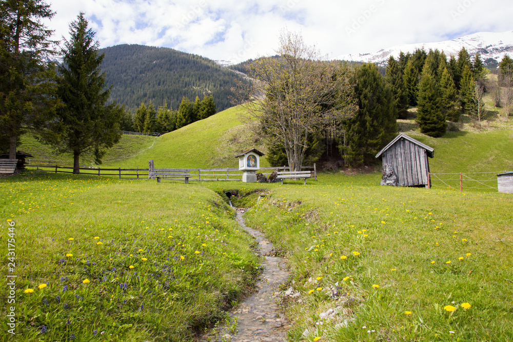 Resting place alongside a hiking trail with a bench and a wayside shrine in the luscious meadows of the Tyrolean Alps.