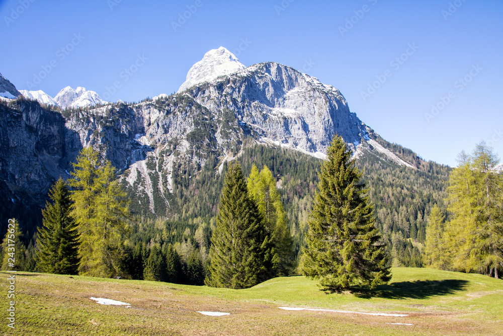 Lush green alp meadow with pine tree forests and view on the Zugspitze mountain, Ehrwald, Austria.