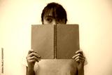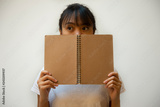 Asian Filipino cute teenager girl hiding her face behind brown notebook background
