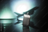 stack of traveling luggage in airport terminal and passenger plane flying over sky