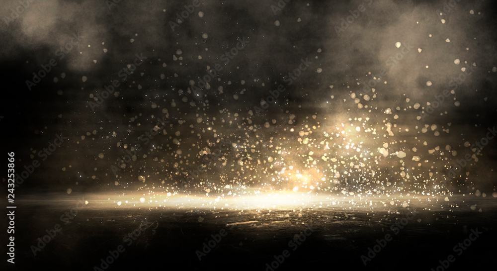 Background of an empty dark room. Empty walls, neon light, smoke, glow
