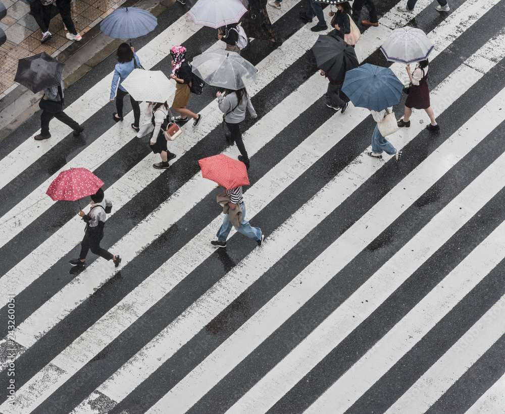 Tokyo Crosswalk Scene on the Rainy Day from above