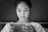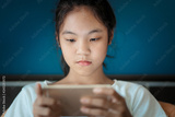 teenage girl sitting in bed playing a smartphone in social internet in the dark light under the blacket. The blue light has a negative effect on the child's eyes.