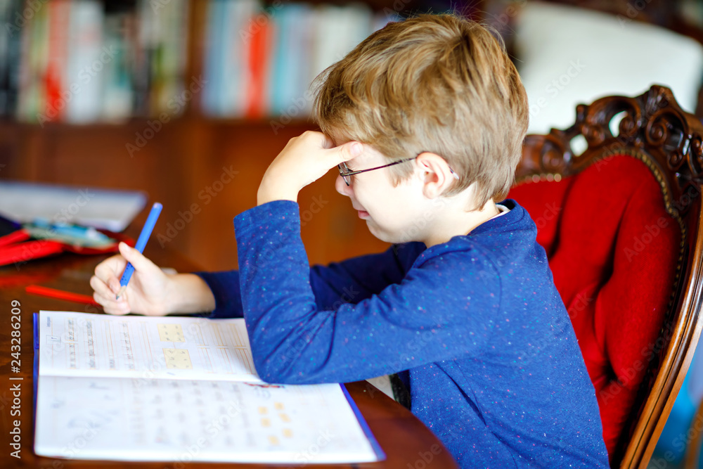 Portrait of frustrated crying sad school kid boy at home making homework. Little child writing with colorful pencils, indoors. Elementary school and education