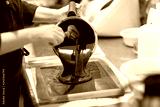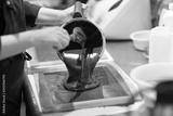 production, cooking and people concept - confectioner filling mold with chocolate at confectionery shop