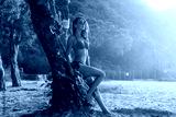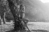 Full-length portrait of fit young woman in pink bra and black panties sitting on tree trunk wearing sunglasses with green jungles in background