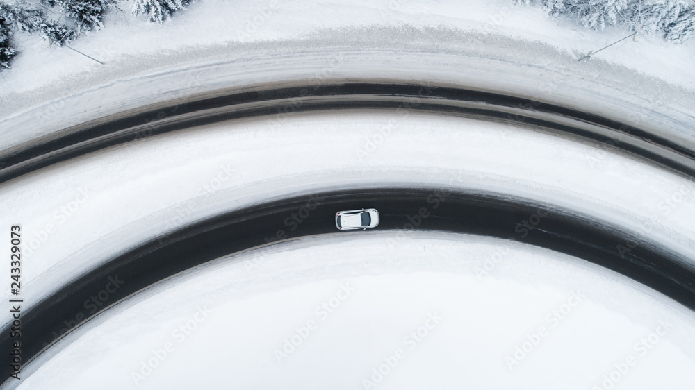 Car on winding winter road. View from above.